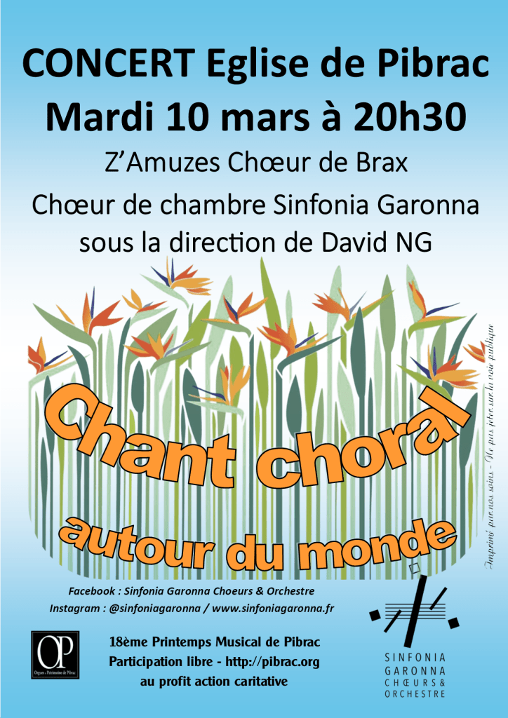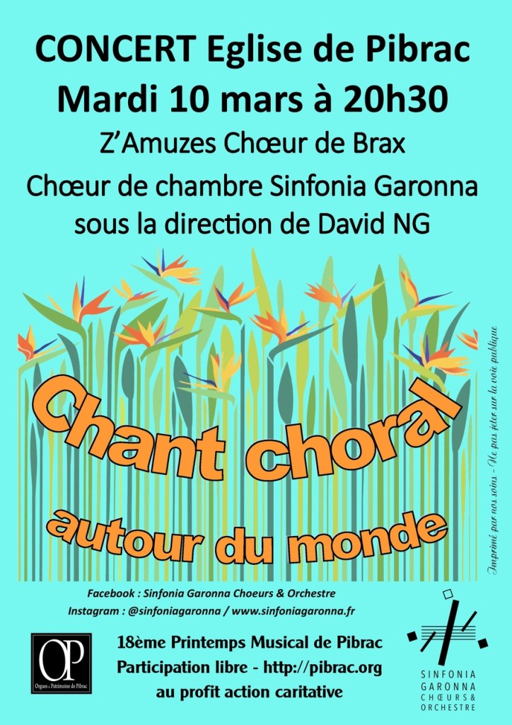 | Mardi 10/03/2020 | 20h30 | Concert choral « autour du monde » avec Sinfonia Garonna : Choeur de Chambre et Les Z’Amuses Choeur de Brax-Léguevin direction David NG les ZAmuses Cheur : chants du monde Choeur de chambre : Bruckner, Poulenc, Ravel, Taverner … Facebook : Sinfonia Garonna Choeurs & Orchestre Instagram : @sinfoniagaronna www.sinfoniagaronna.fr | entrée libre |