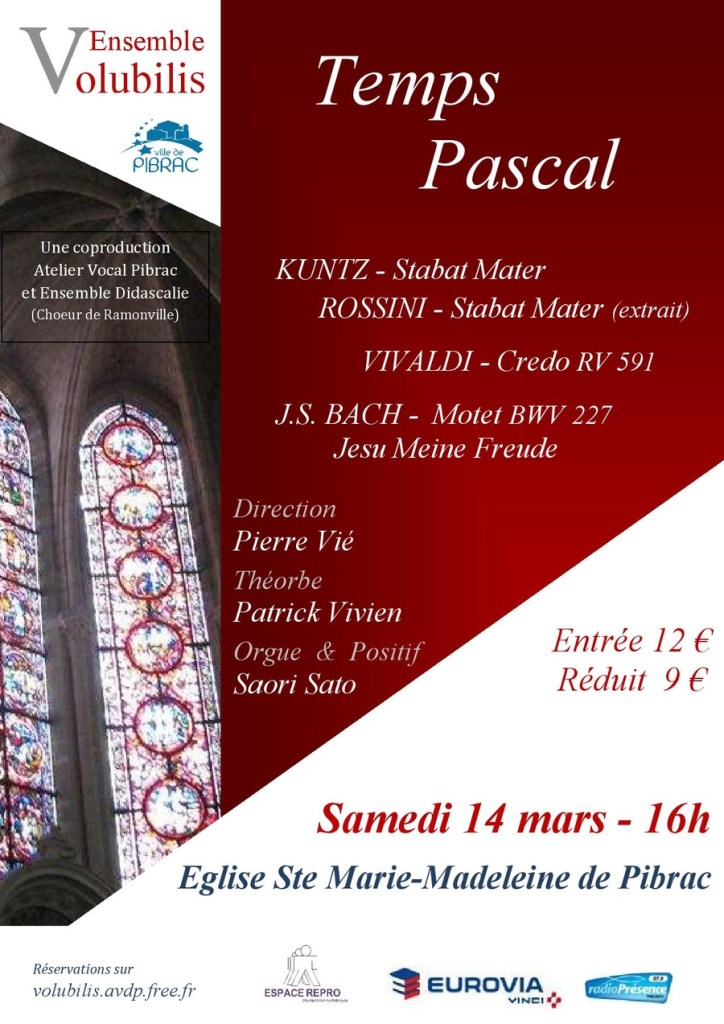 | Samedi 14/03/2020 | 16h | programme conçu pour le temps Pascal chœur Volubilis orgue et positif Saori Sato direction Pierre Vié KUNTZ – Stabat Mater / ROSSINI – Stabat Mater (extrait) / VIVALDI – Credo RV 591 / J.S. BACH – Motet Jesu Meine Freude BWV 227. réservation site internet : http://volubilis.avdp.free.fr/ | tarif 12 € réduit 9€ |