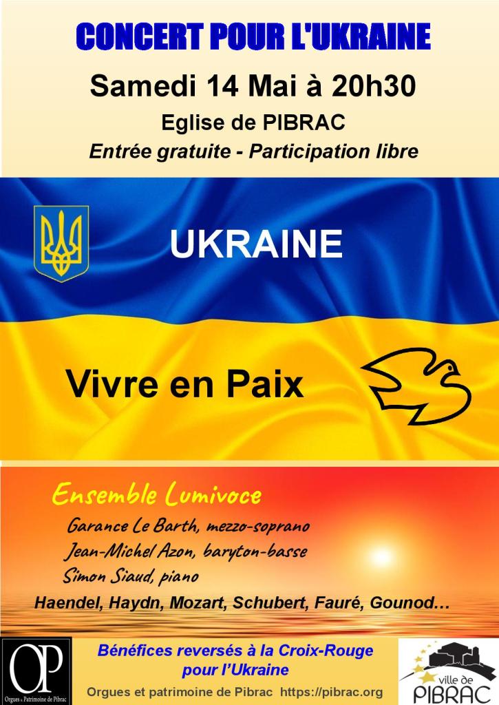 L’association « Orgues et Patrimoine de Pibrac » vous invite à un concert de soutien pour l’Ukraine, le samedi 14 mai 2022 à 20h30., dans l’église de Pibrac, avec l’ensemble Lumivoce. Garance Le Barth (mezzo-soprano) et Jean-Michel Azon (baryton-basse) ont conçu ce concert « Ukraine Guerre et Paix », inspiré des événements en cours, mêlant textes et chants.