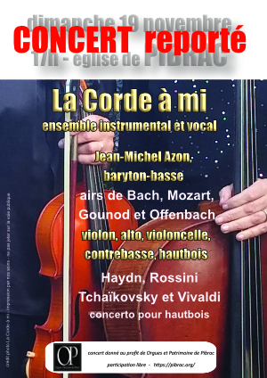 Ne pouvant assurer l’intégralité du programme annoncé, suite à certaine indisponibilité, les membres du groupe « La Corde à Mi » préfèrent remettre cette rencontre musicale avec son public pibracais.